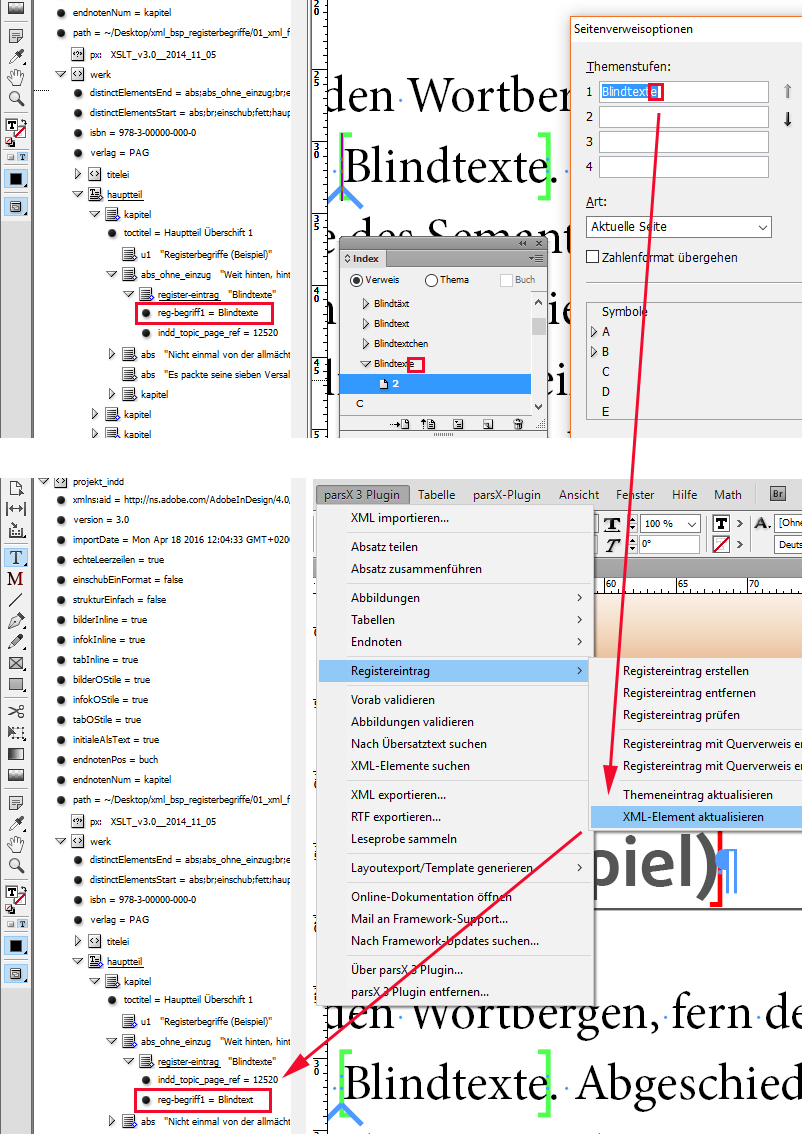 Änderungen an den Registerbegriffen müssen in der XML-Struktur und im InDesign Indexbedienfeld ausgeführt werden.