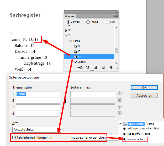 Das Attribut @relevanz mit dem Attributwert "hoch" entspricht der Option "Zahlenformat übergehen" im Indexbedienfeld. Damit kann beim Generieren des Registers der entsprechenden Seitenzahl eines Themeneintrags ein anderes Zeichenformat zugewiesen werden (als Standard wird vom Plugin "fett" vergeben).
